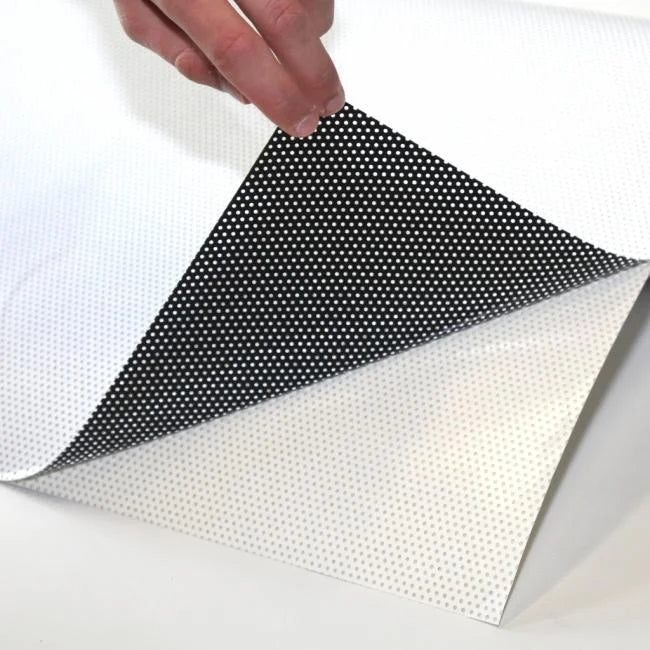Clear removable adhesive. 1.5 mm holes, 65/35 perforation pattern. Black/White PVC laminate with removable pressure sensitive adhesive with release sheet. Designed for all window applications except vehicles. Outdoor durability up to 3 years ; 6 months for clean removal.